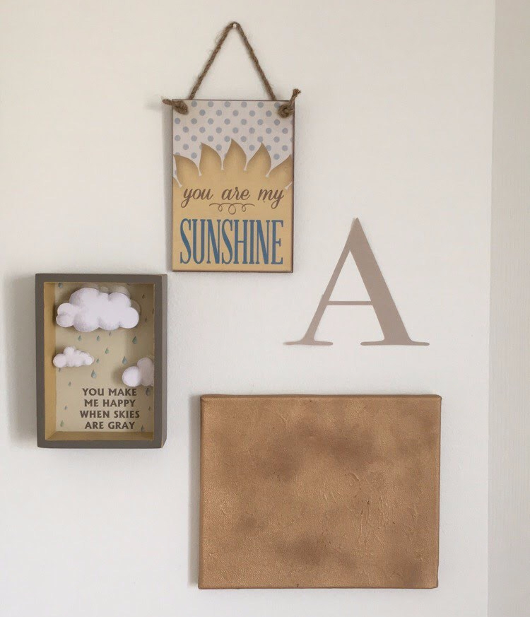 When New Baby was born, I just got tired of it and decided it was time for a fresh start. Fresh baby, fresh start, fresh room for her to thrive developmentally and explore her imagination. Since she has a mocha colored bed and oak floors, I wanted to keep a “nature” feel with a soft touch. I got the floral leaves from Dollar Tree and stuck them in an old flower pot I had sitting in my kitchen window sill. The pink vintage fan was a college gift for my dorm (10 years ago). I spray painted it Satin Blush to match her wall decor. I used some glitter glue and a stencil to make the “family” canvas hanging. I also spray painted another small canvas after splattering paint to give it abstract texture on the adjacent wall. The sunshine hangings were part of a baby shower gift for New Baby.