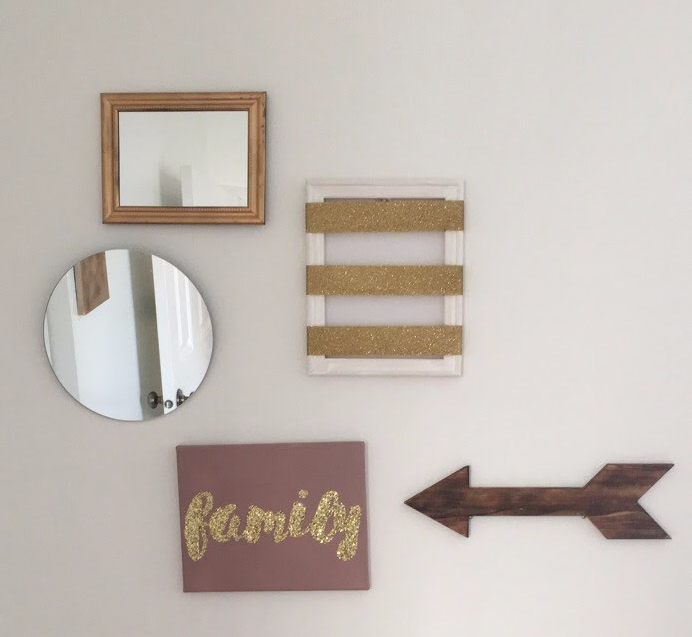 The arrow was on clearance at Meijer, and I used some old canvas frames to make the hair bow/clip organizer. The mirrors are also from Dollar Tree. Mirrors are great for making small spaces seem larger.